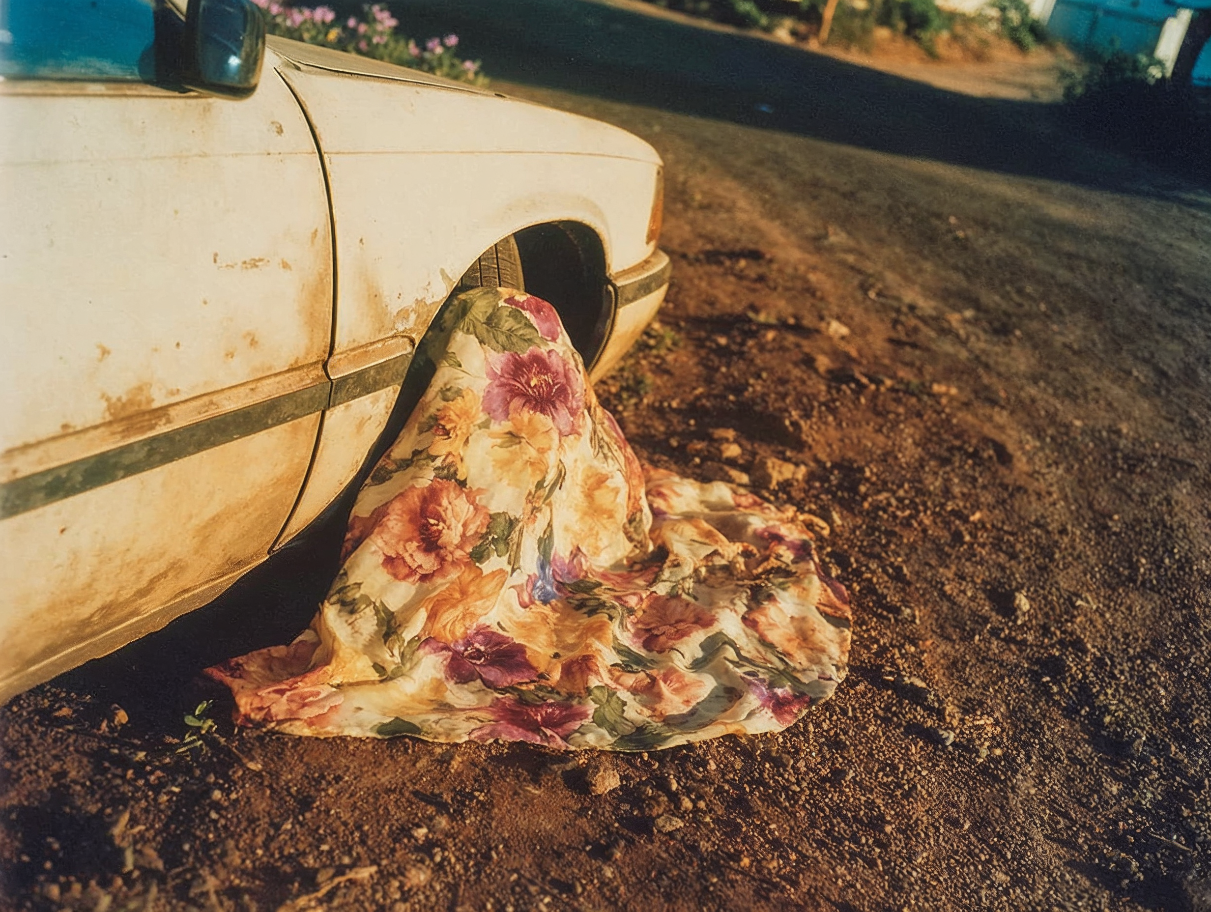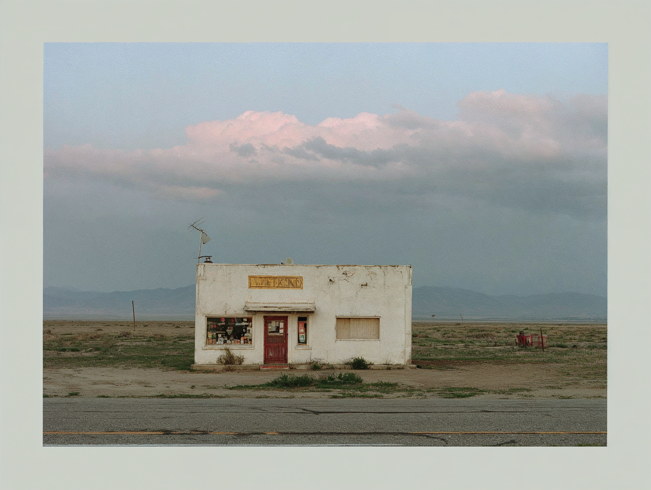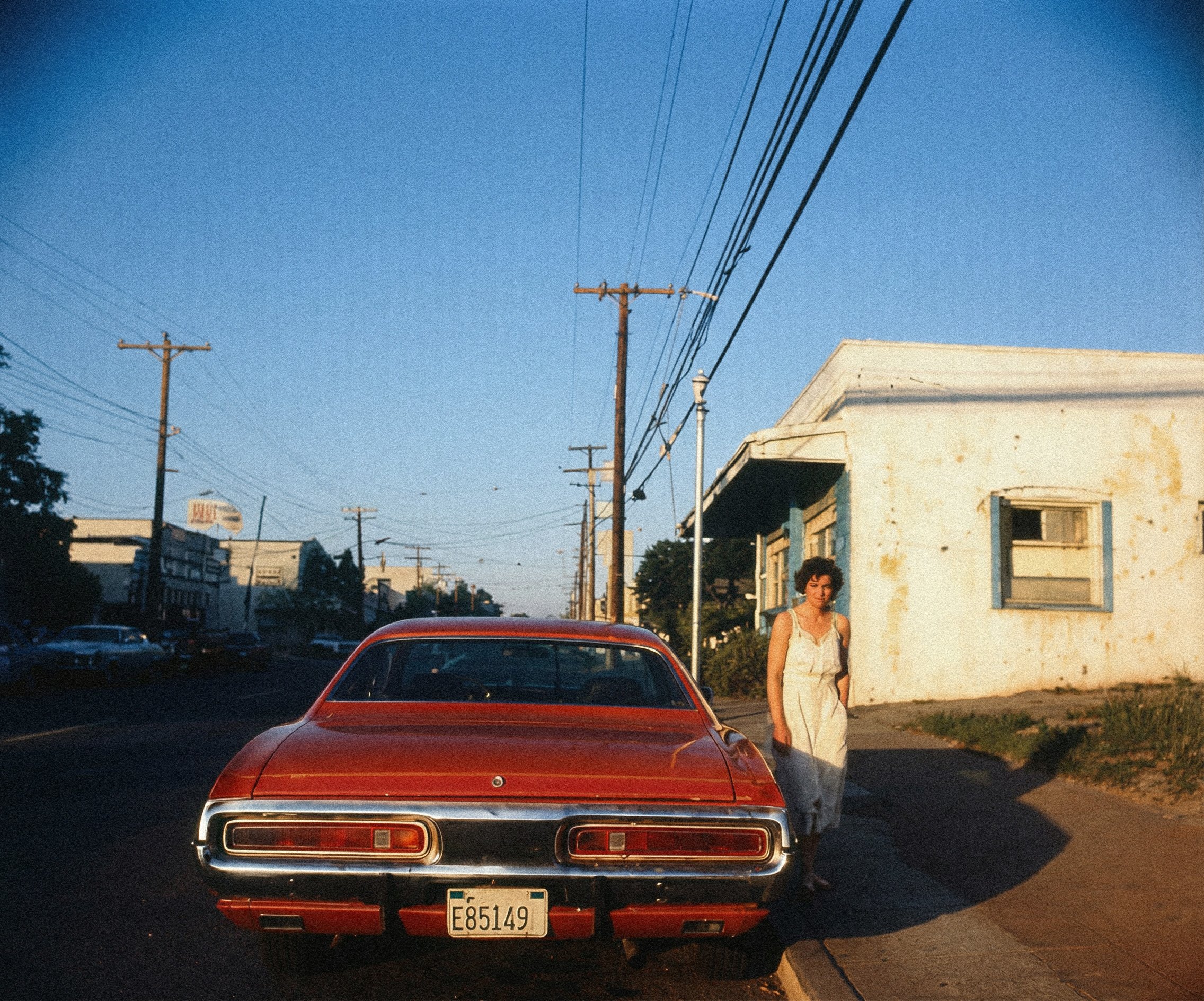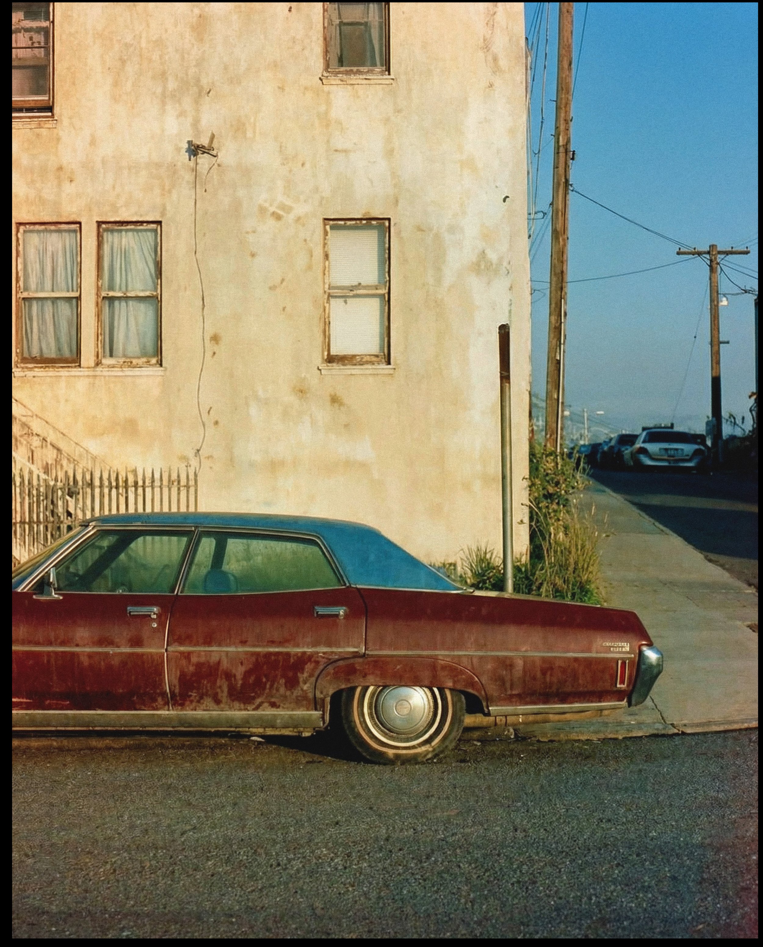 The visual framework draws from tradition. Deadpan framing. Flat, harsh midday light with no atmospheric romance. Slight telephoto compression that flattens depth and isolates structures against their surroundings. Color is built on a faded Ektachrome palette.