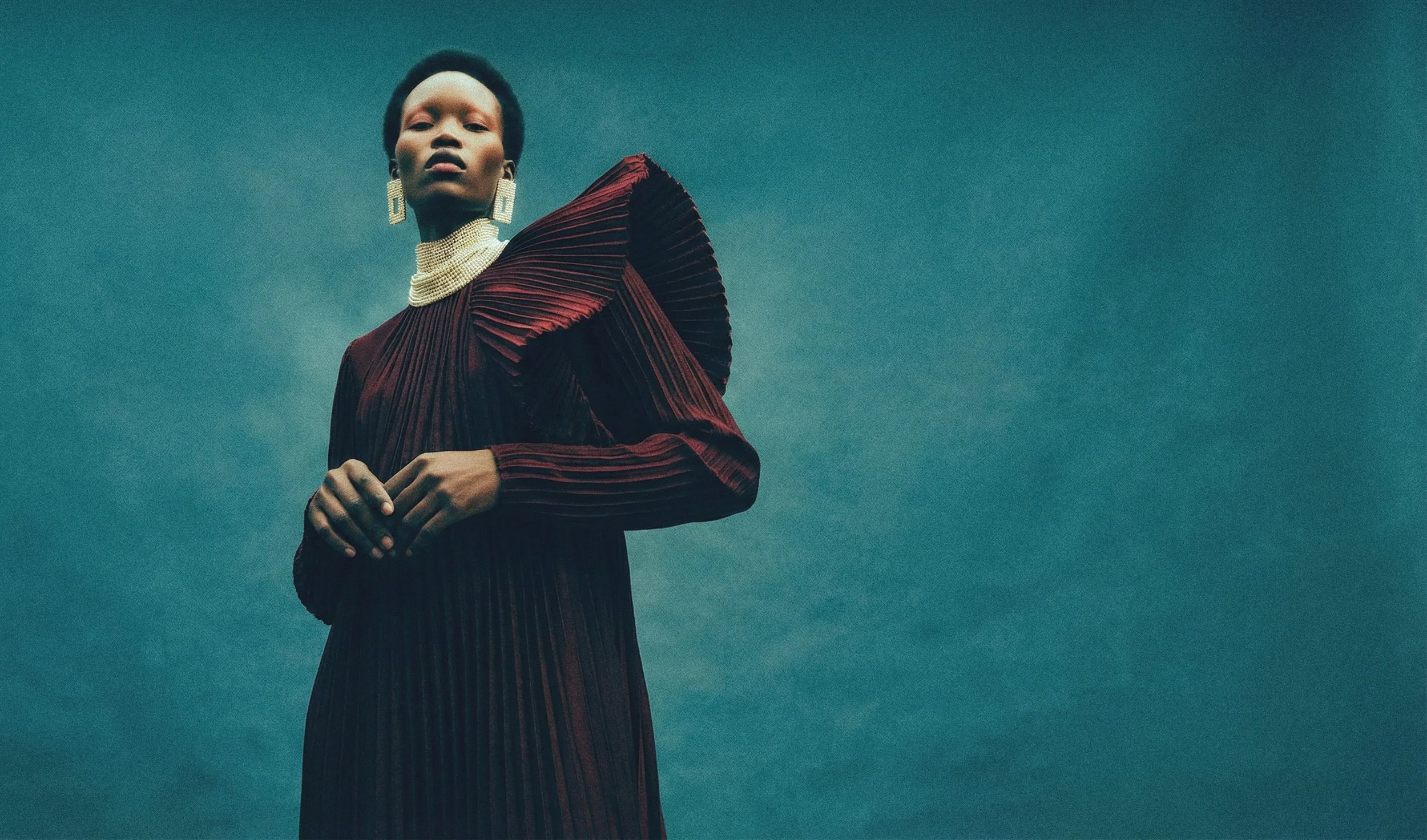 Deep burgundy sits against cool teal, creating a deliberate push and pull between warmth and distance.